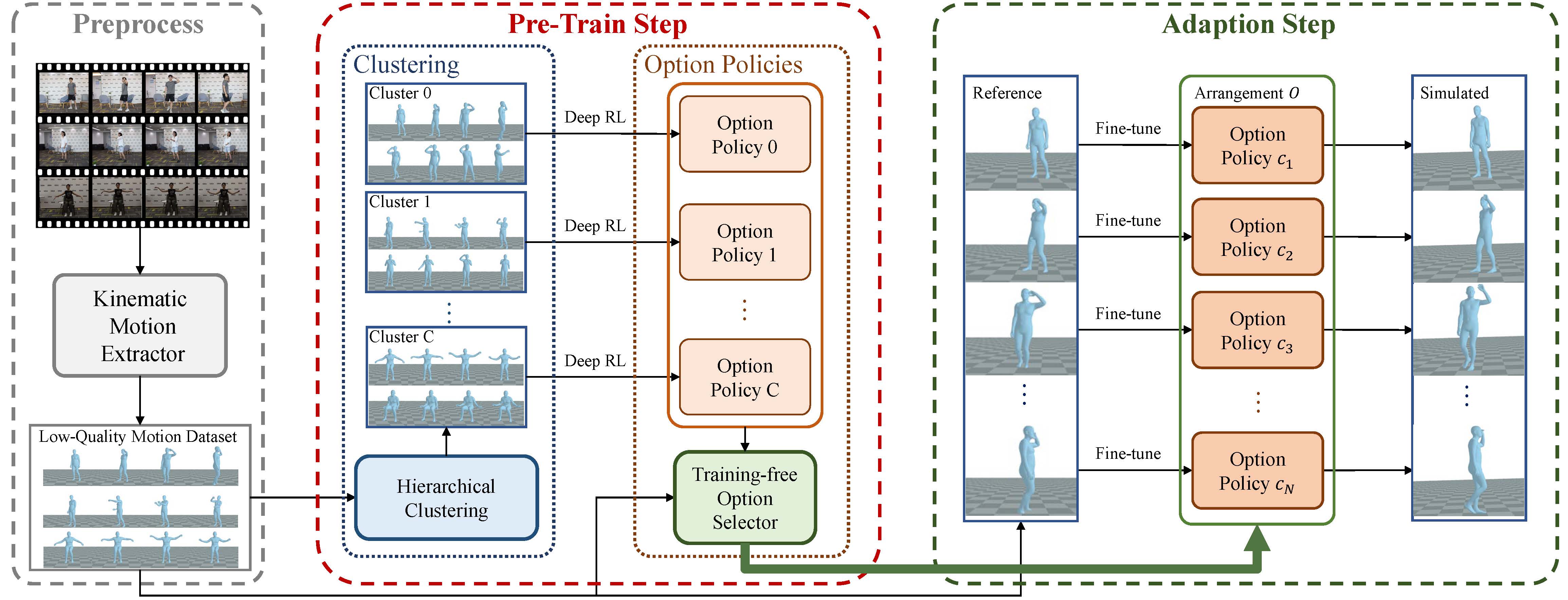System overview. Our system comprises three main steps: preprocessing, pre-training, and adaptation. In the preprocessing, we extract kinematic motion data from videos, resulting in a low-quality motion dataset. During the pre-train step, we apply hierarchical clustering to group the low-quality dataset into several clusters, and train option policies to mimic motions sampled from the clusters using deep reinforcement learning. Finally, in the adaptation step, an option selector arranges the option policies to mimic the reference motion. After fine-tuning for several minutes, we obtain high-quality simulated motions.